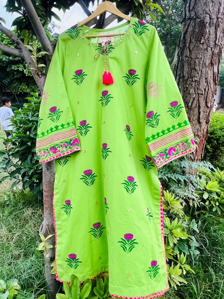 A Lime Flora Handblock Shirt featuring bold thistle florals, gold tamba gota neckline detailing, and hot pink tassel accents. Made from soft cotton.