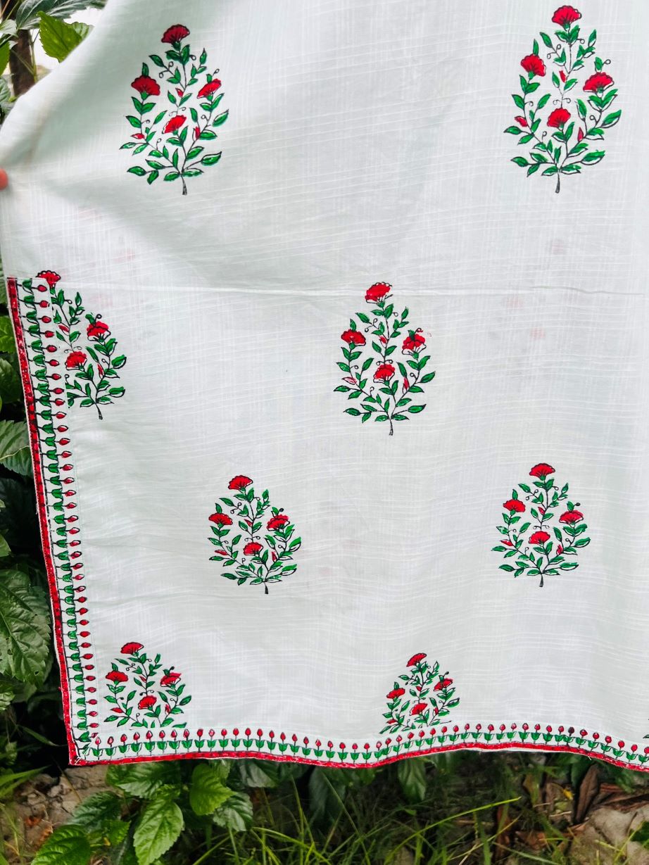 - 🌺 Design: Handblock floral prints in red and green