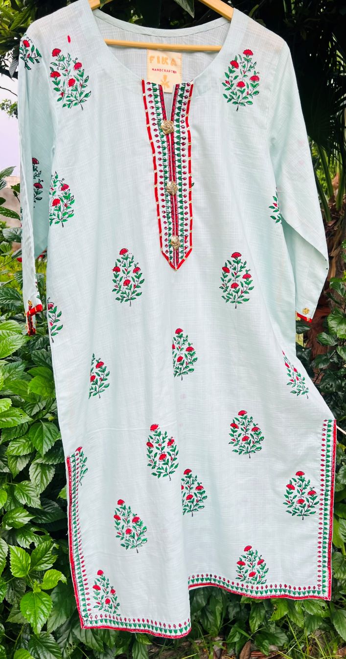 Ocean Breeze Handblock Kurta with red and green floral motifs, gota button neckline, and straight cut. Made from soft cotton. Custom sizes available via WhatsApp.