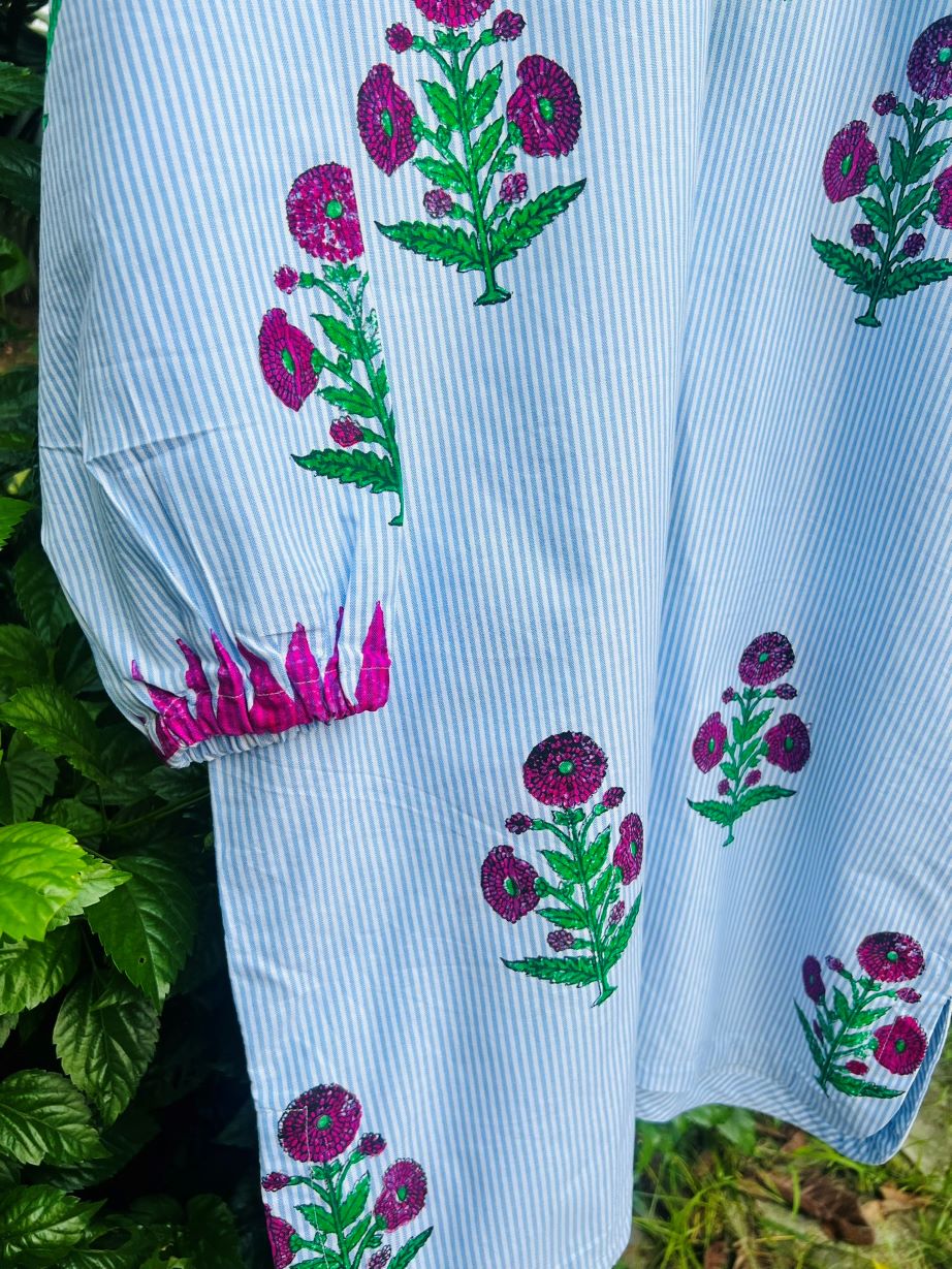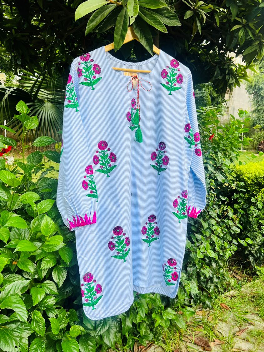 Poppy in Lines (Round) Kurta: Light blue short kurta with hand block printed maroon poppy flowers, green accents, tassel neckline, and round hem. Comfortable cotton. Custom sizes via WhatsApp.