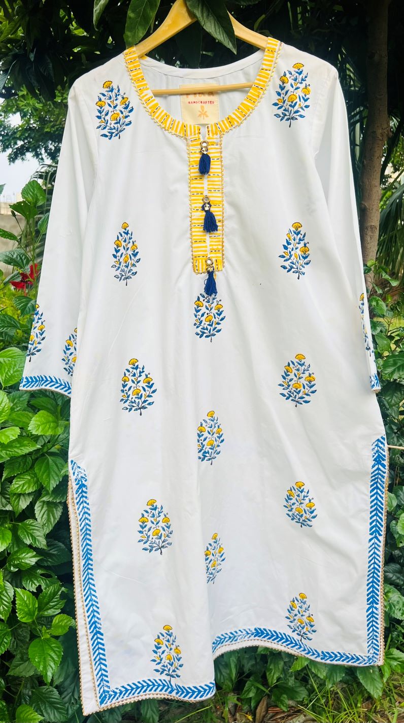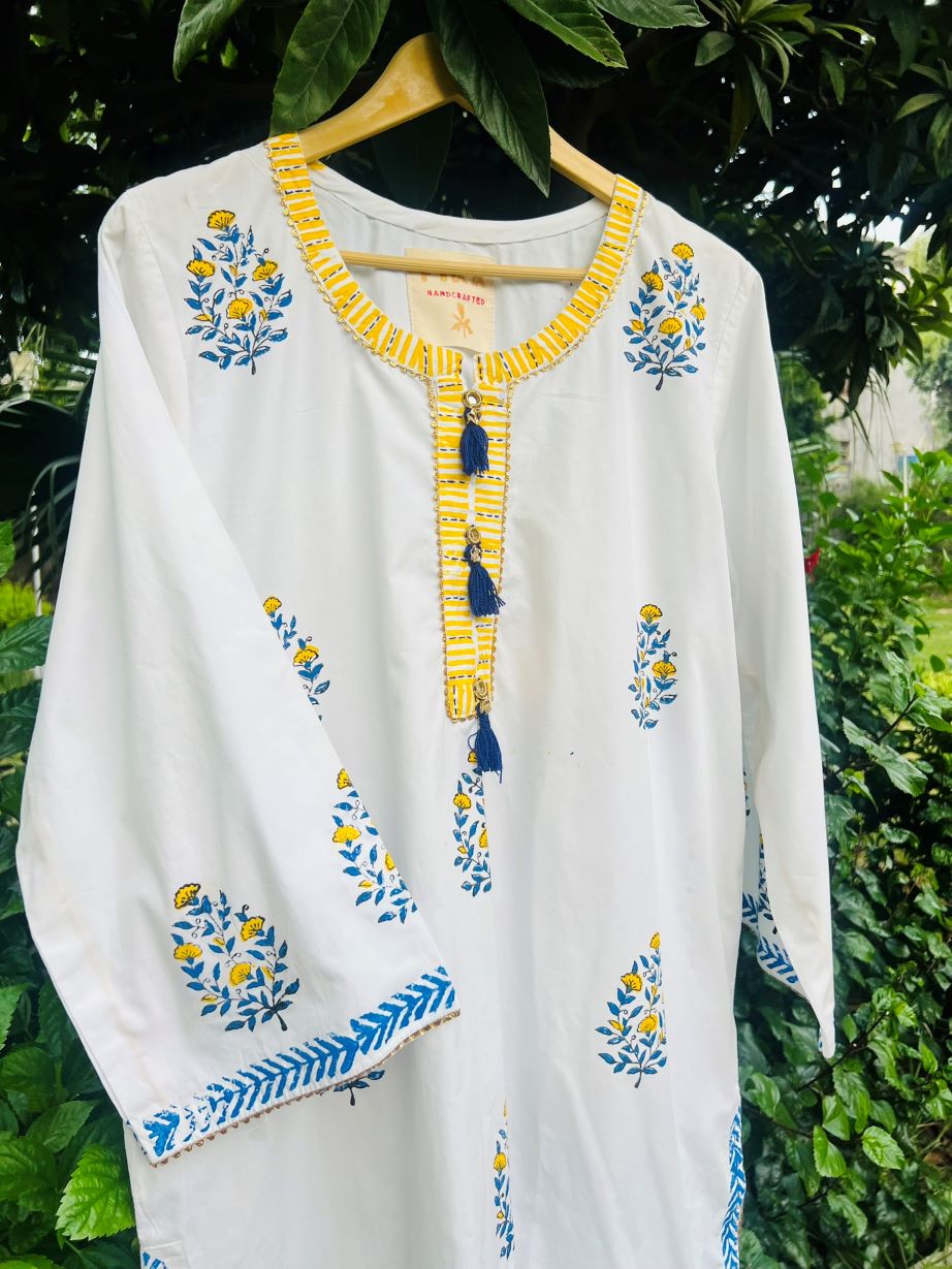 White hand block printed kurta with yellow, golden, and blue floral motifs. Neckline embellished with kacha tanka, mirrors, tassels, and golden lace. Straight cut with custom sizes via WhatsApp.