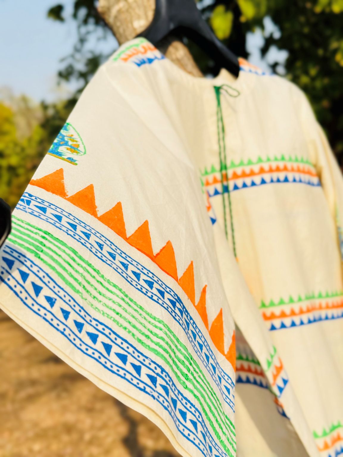 Hand block printed Long kurta with vibrant triangular motifs and tassel tie neckline. Custom sizes available.